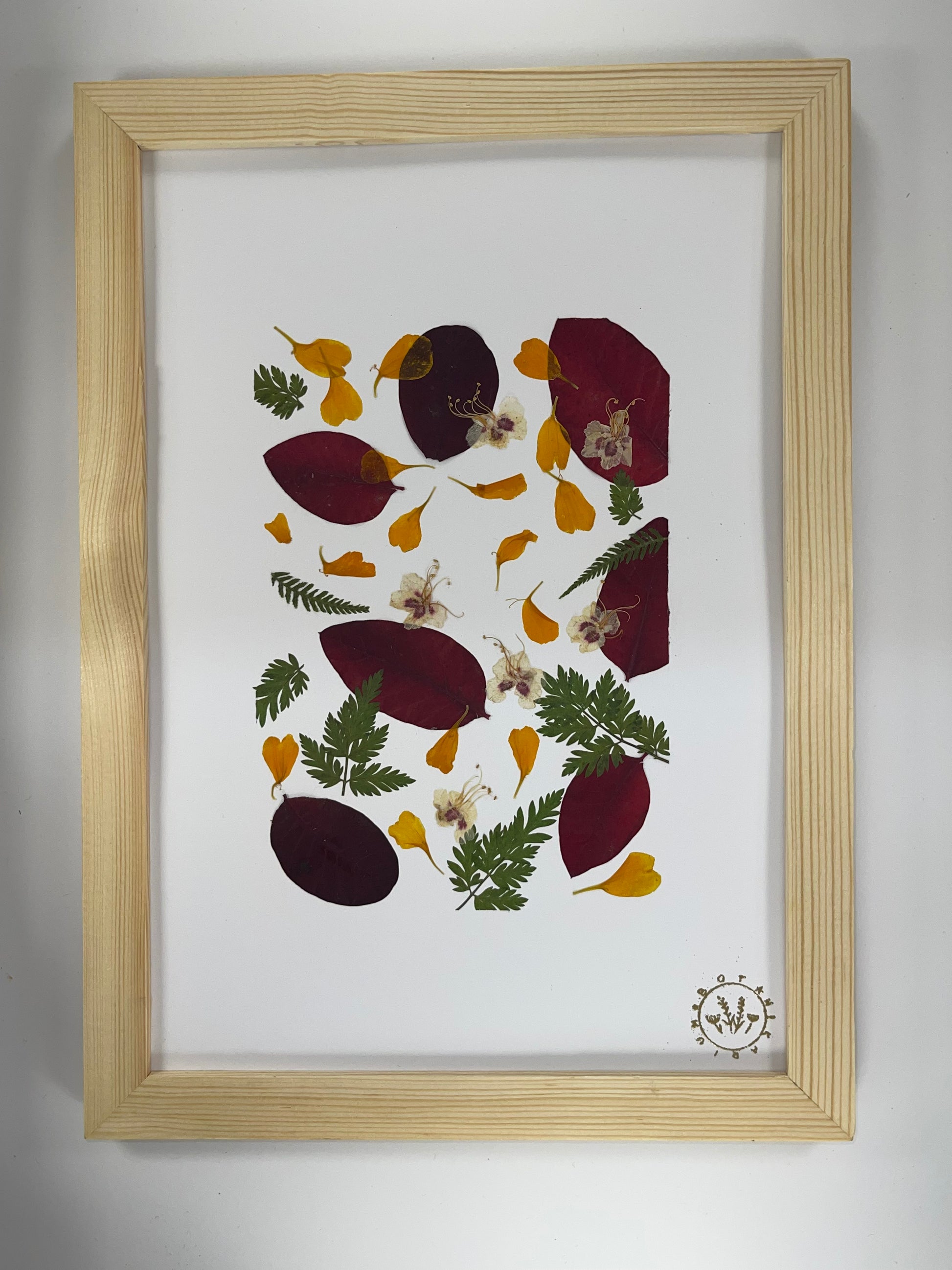 Ta kompozycja jest jedyna w swoim rodzaju i wykonana z prawdziwych kwiatów, które były uprawiane i zbierane w moim ogrodzie, prasowane tygodniami i ręcznie klejone.