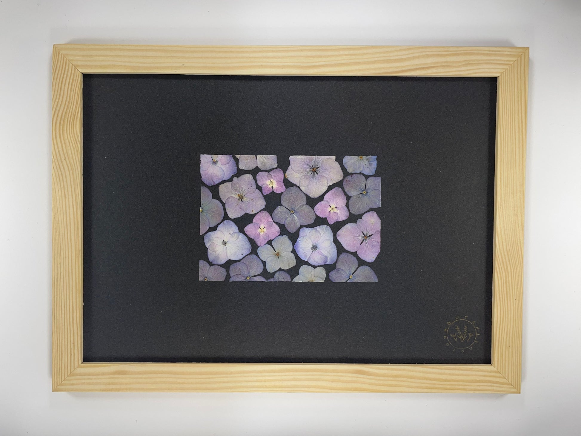 Ta kompozycja jest jedyna w swoim rodzaju i wykonana z prawdziwych kwiatów, które były uprawiane i zbierane w moim ogrodzie, prasowane tygodniami i ręcznie klejone.