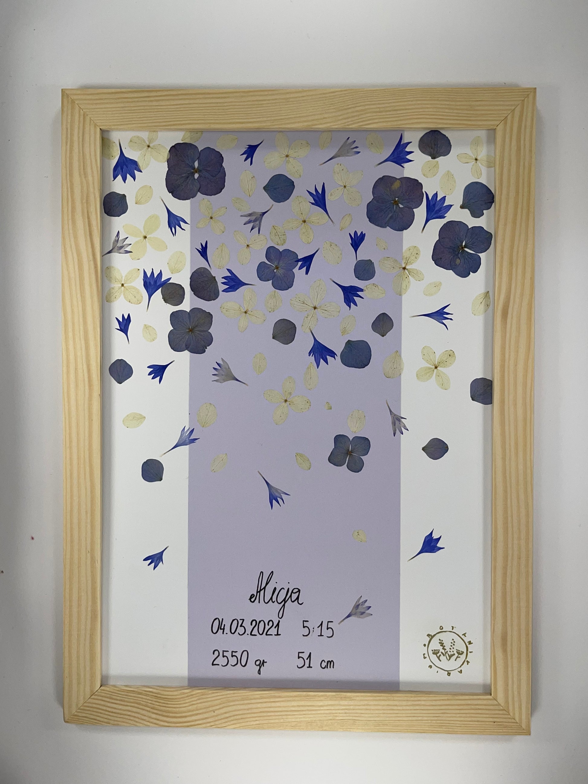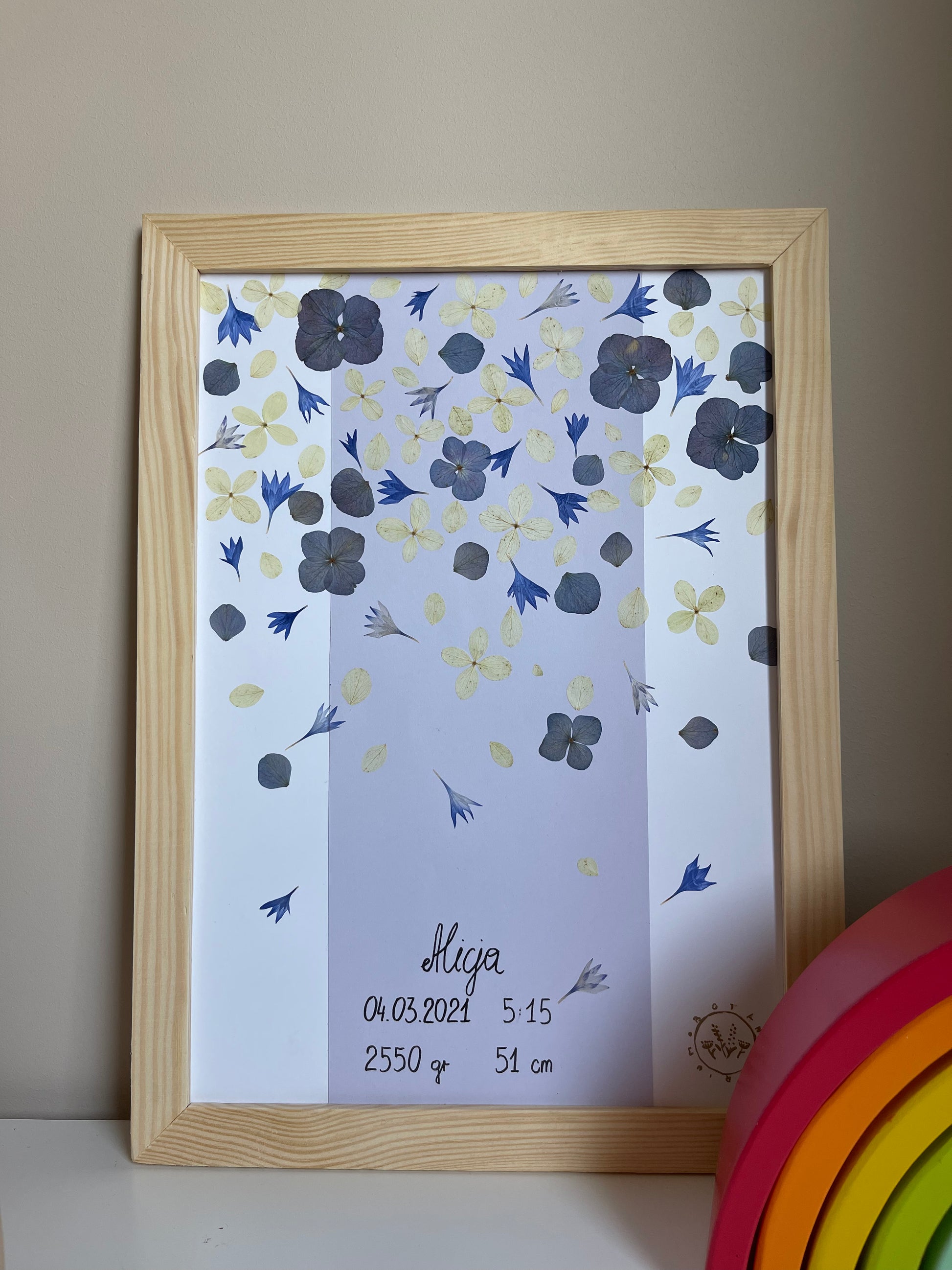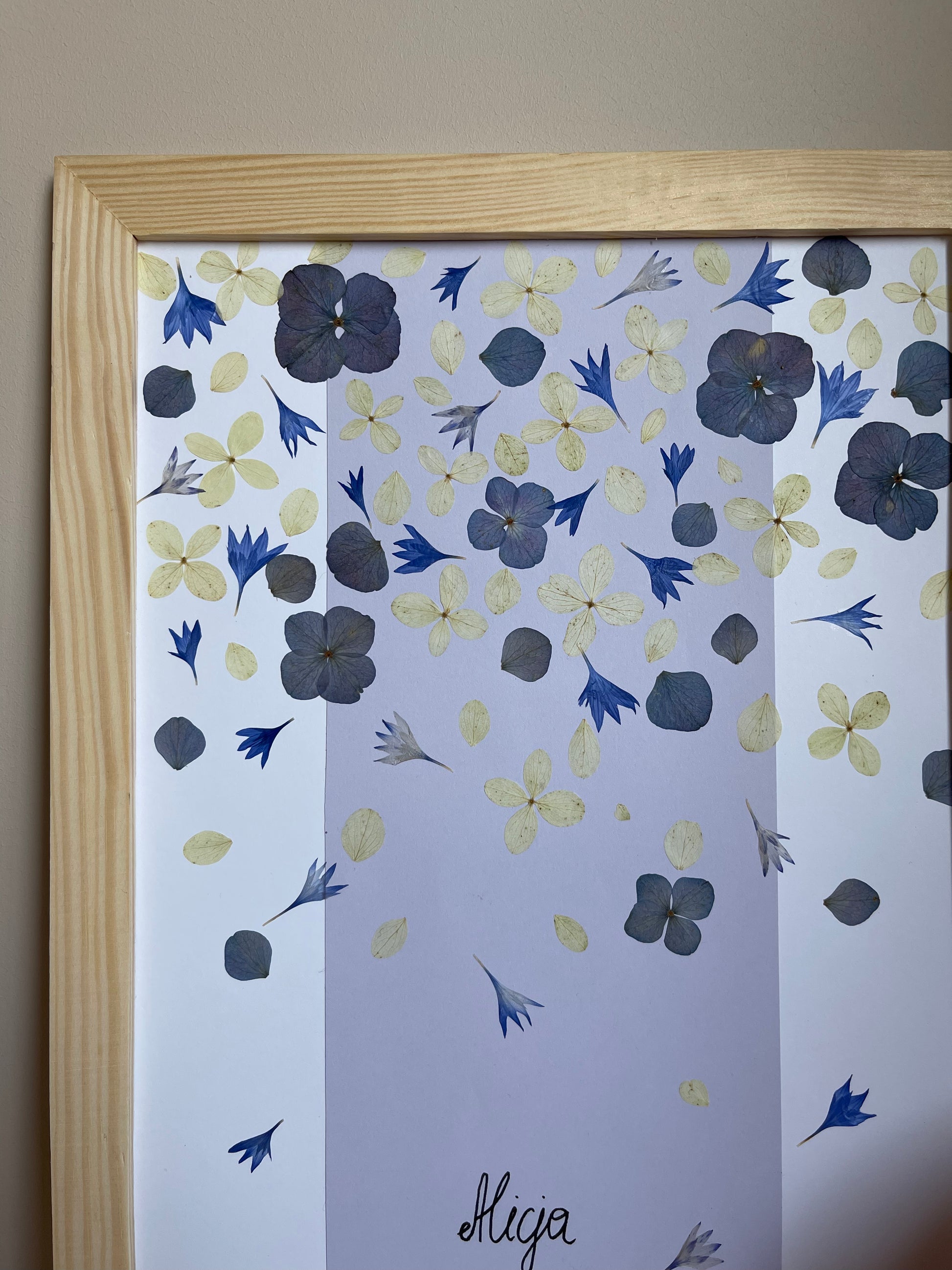 Ta kompozycja jest jedyna w swoim rodzaju i wykonana z prawdziwych kwiatów, które były uprawiane i zbierane w moim ogrodzie, prasowane tygodniami i ręcznie klejone.