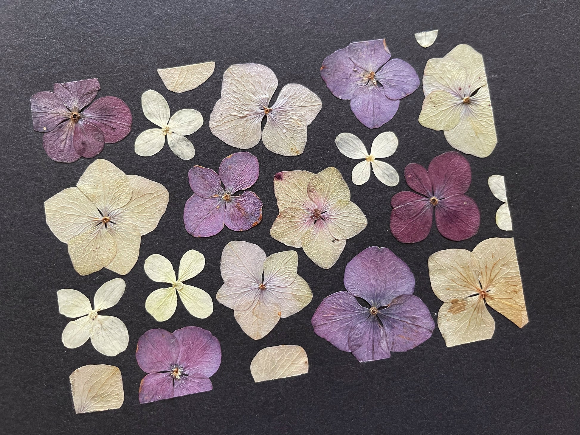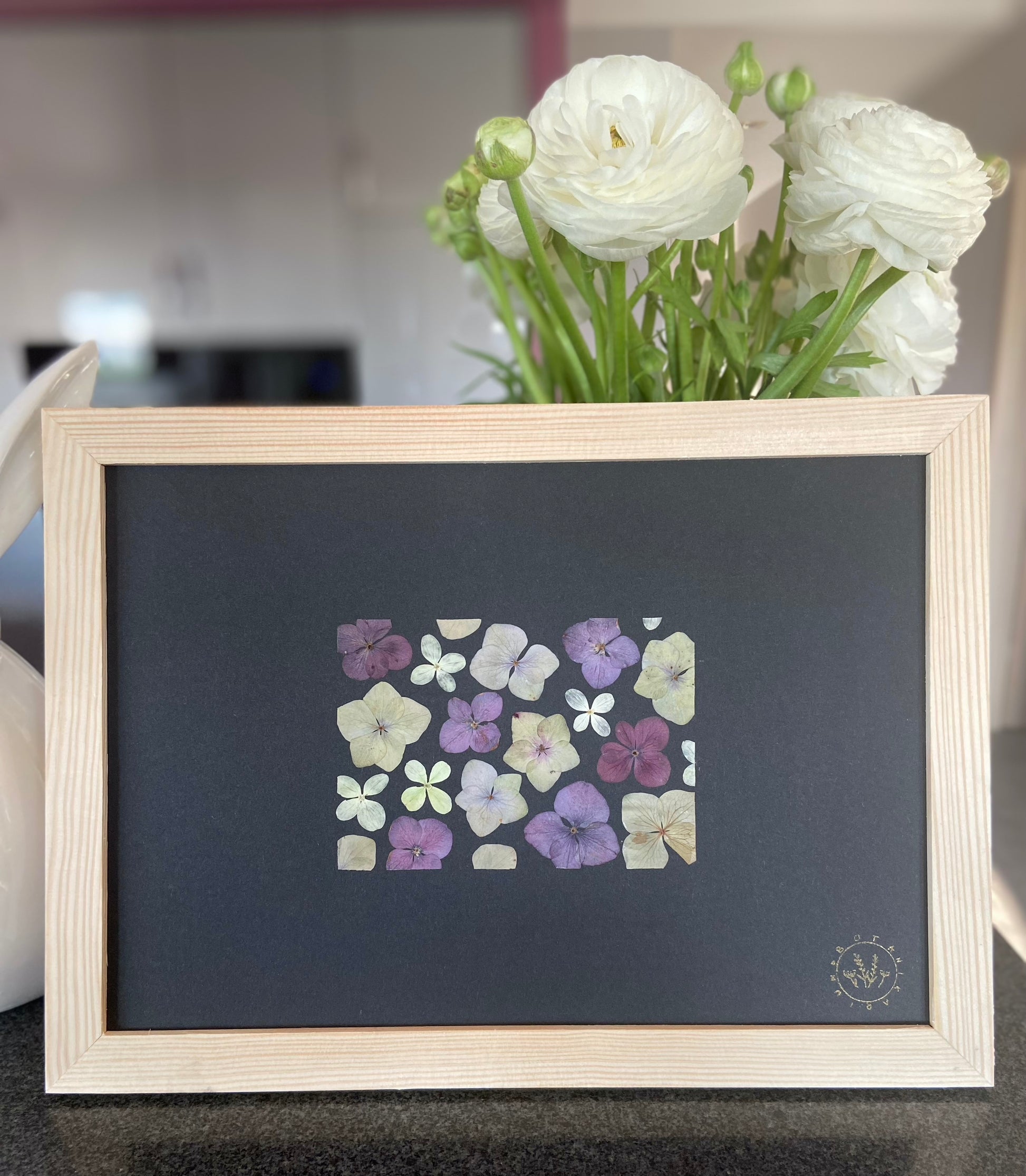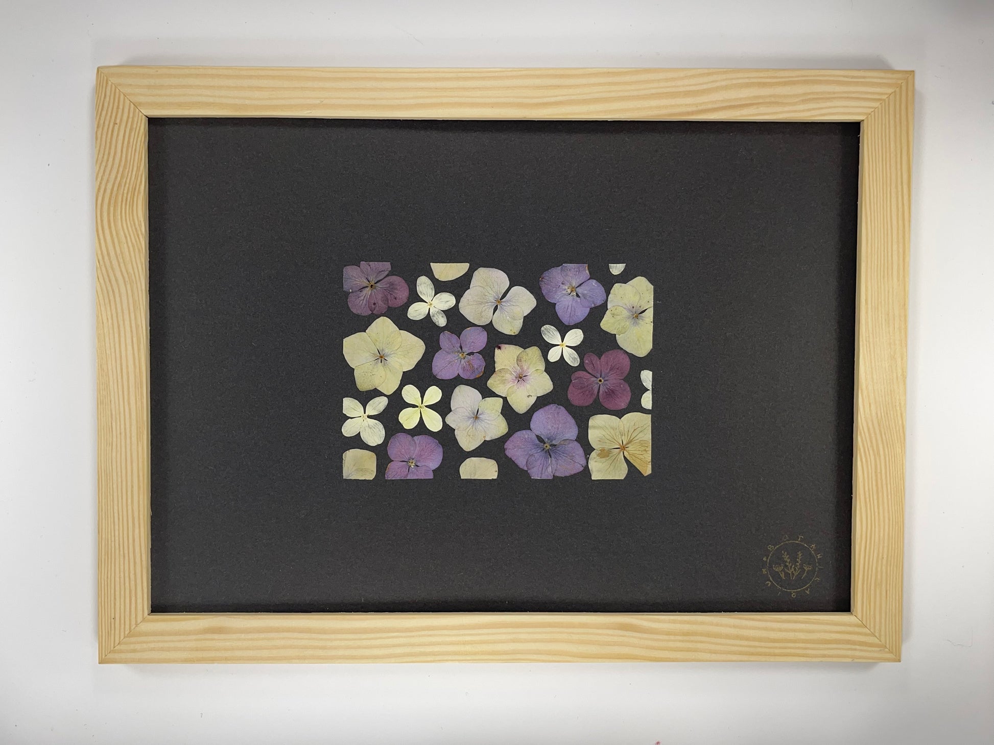 Ta kompozycja jest jedyna w swoim rodzaju i wykonana z prawdziwych kwiatów, które były uprawiane i zbierane w moim ogrodzie, prasowane tygodniami i ręcznie klejone.